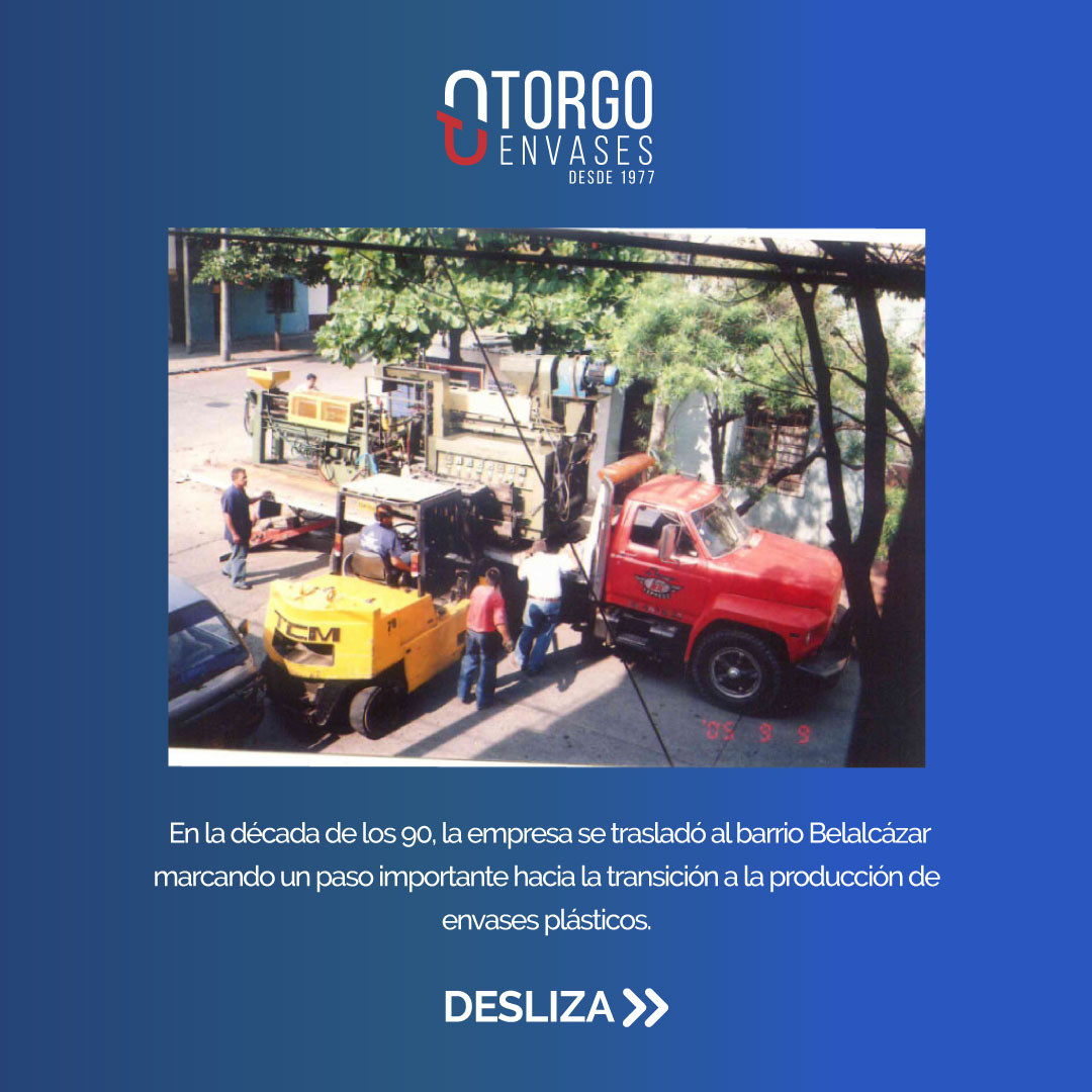 En los a帽os 90s, dimos un gran salto en nuestra evoluci贸n como empresa al trasladarnos al barrio Belalc谩zar, un momento clave que marc贸 el inicio de la producci贸n de envases pl谩sticos.