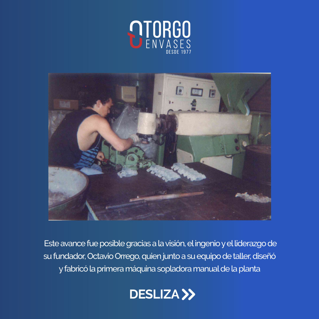 Este avance fue liderado por nuestro fundador, Octavio Orrego, quien, junto a su equipo de taller, dise帽贸 y fabric贸 la primera m谩quina sopladora manual de la planta, consolidando nuestra capacidad de innovaci贸n.